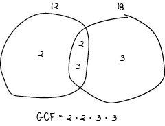 The greatest common factor of a pair of numbers is the largest whole number value that is a factor of both numbers. One method of finding the greatest common factor is to do the prime factorization of both numbers and find the product of the prime factors that the two numbers have in common. The prime factorization of 12 is 2 × 2 × 3 and of 18 is 2 × 3 × 3. The prime factors that 12 and 18 have in common are 2 and 3 so the greatest common factor is 6.