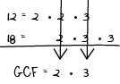 the model shows the factors of the 2 numbers. the first line is 12 equals 2 times 2 times 3. the second line is 18 equals 2 times 3 times 3. the 2 and the first 3 on the second line are vertically aligned with the second 2 and the 3 on the first line. vertical arrows are drawn through the aligned numbers, pointing down to the 2 and the 3 on the next line of text, which is gcf equals 2 times 3.